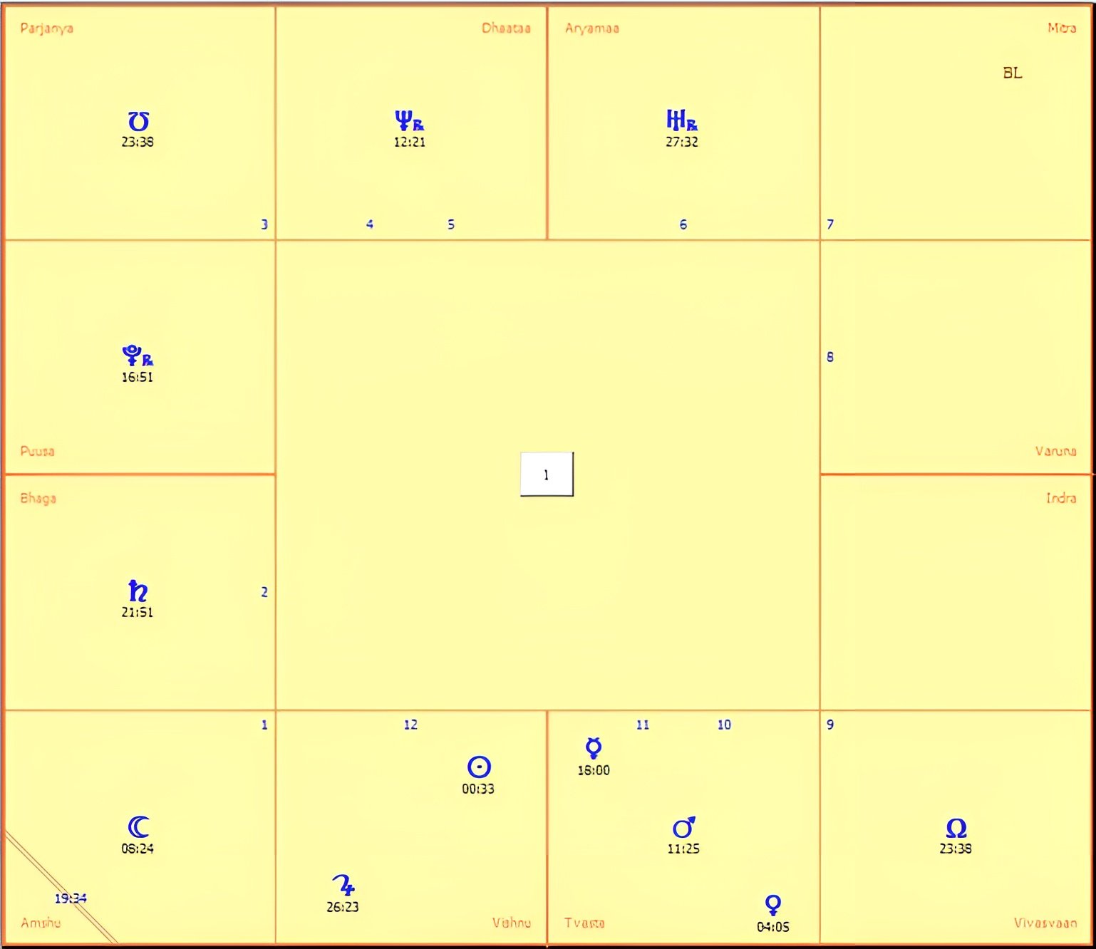 A fixed Rasi aspects the movable Rasis except the movable Rasi right next to it. Aryamaa aspects Bhaga,Tvasta, and Varuna. Indra aspects Dhaata, Bhaga, and Tvasta. Vishnu aspects Varuna, Dhaata, and Bhaga. Pusaa aspects Tvasta, Varuna and Dhaata.