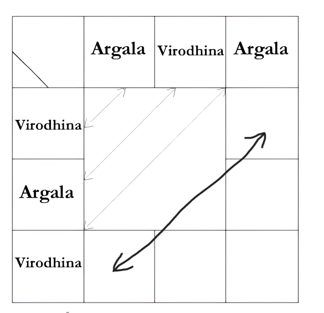 Just as certain positions foster growth, others act as counter-forces. This is known as Virodhina (obstruction). The Virodhina places are diametrically aligned with the Argala places, effectively "neutralizing" the forward motion: Argala Position — 2nd House, 12th House, 11th House | Virodhina Position — 3rd House, 4th House, 10th House
