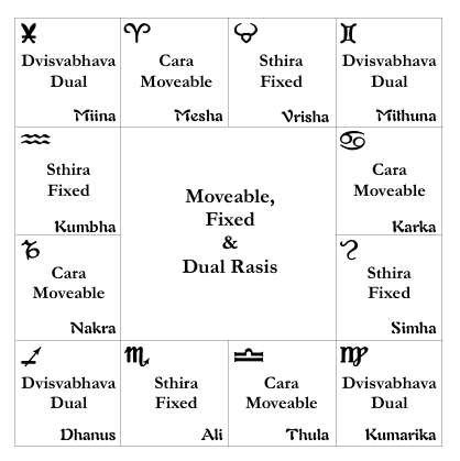 A moveable Rasi aspects the fixed Rasis, except the fixed Rasi right next to it. Dhaata aspects Indra, Vishnu, and Puusa. Varuna aspects Vishnu, Puusa, and Aryamaa. Tvasta aspects Puusa, Aryamaa, and Indra. Bhaga aspects Aryamaa, Indra, and Vishnu.